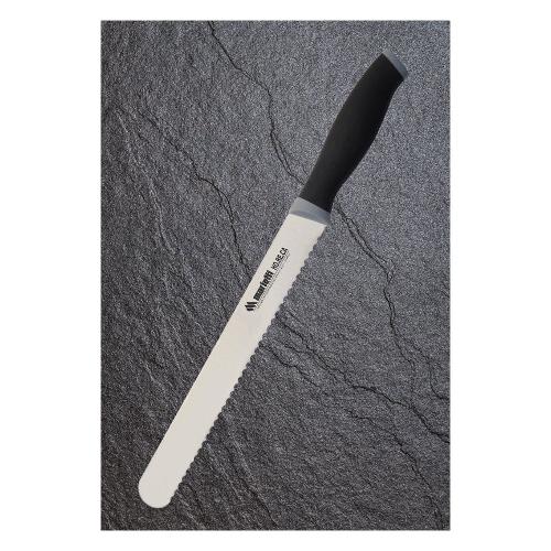 Coltello da pane con lama in acciaio conico inox 50crmov14 aisi 420 a durezza elevata 54/55 hcr che ne preserva elasticità e flessibilità per usi quotidiani con finitura satinata. Il manico ergonomico é realizzato in doppio stampaggio e rifinito con un termopolimero gommoso antiscivolo e atossico di colore nero e grigio adatto per il lavaggio anche in lavastoviglie.
