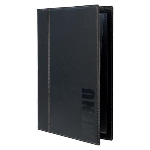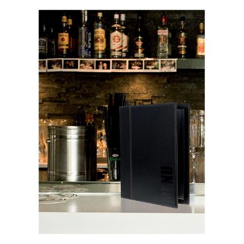 Porta menù in similpelle. Scritta "menu" stampata In bassorilievo sulla copertina. Elastico all’interno per Contenere gli inserti e bordi rifiniti. Facile da pulire.