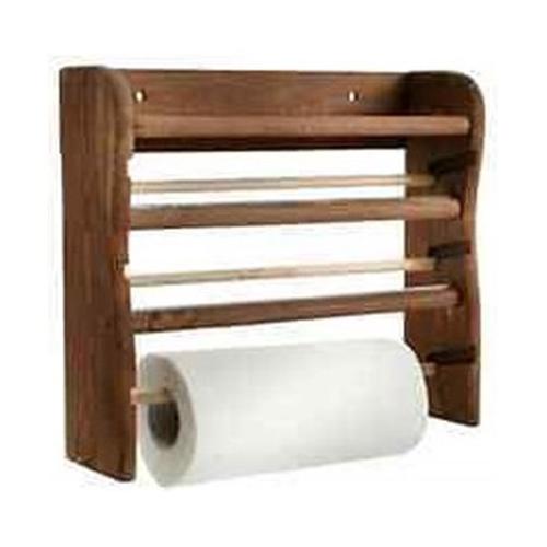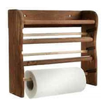 Tris portarotolo in legno scuro. Supporto porta rotolo di carta, pellicola trasparente e pellicola alluminio, tutto in un solo prodotto.