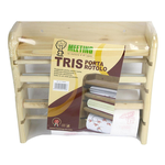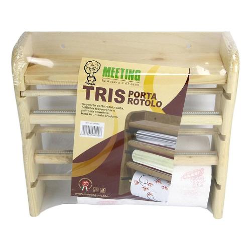 Tris portarotolo in legno chiaro. Supporto porta rotolo di carta, pellicola trasparente e pellicola alluminio, tutto in un solo prodotto.
