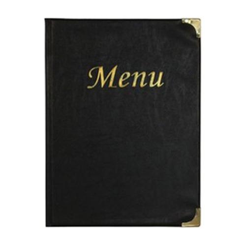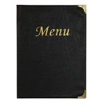 Porta menù in pvc, con scritta "menu" in oro stampata sulla Copertina. Angoli protettivi in metallo dorati, facile da pulire, Disponibile in due colori. Quattro inserti non rimovibili inclusi.