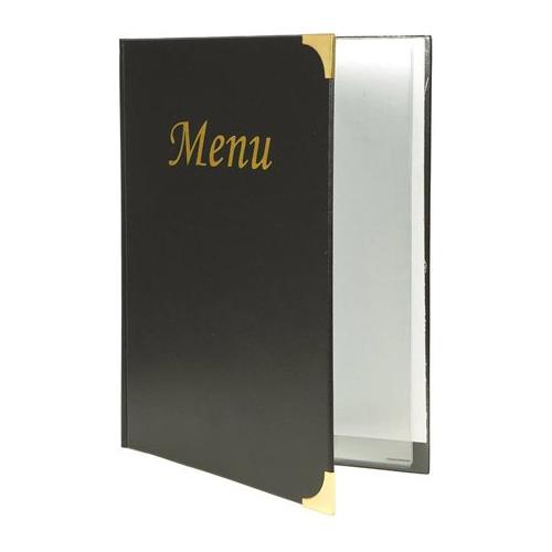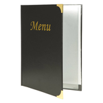Porta menù in pvc, con scritta "menu" in oro stampata sulla Copertina. Angoli protettivi in metallo dorati, facile da pulire, Disponibile in due colori. Quattro inserti non rimovibili inclusi.