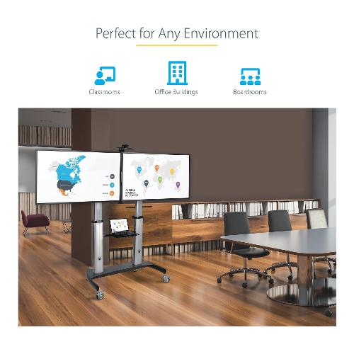 Questo Carrello Porta TV per 2 Schermi permette di creare un centro multimediale AV mobile facile da spostare nelle aule, uffici, sale conferenze, riunioni o ambienti di apprendimento. Per una maggiore stabilità e sicurezza il carrello è dotato di una larga base (122x71cm) che permette di montare due schermi da 37 a 60" e fino a 50 kg cad.
