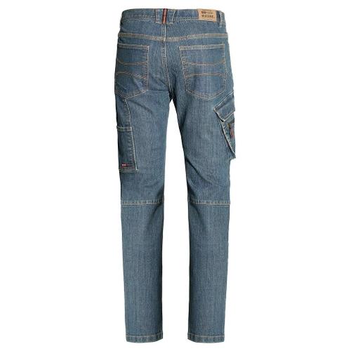 Jeans elasticizzato, con tasca anteriore porta cellulare a scomparsa e tasca posteriore portametro, tascone laterale inclinato a due scomparti con chiusura a patta e zip. Patta con chiusura a bottoni.