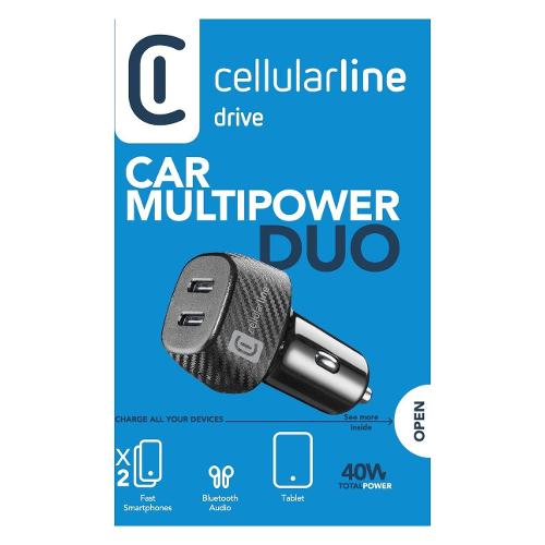 Car Multipower DUO è un caricabatterie da auto con due porte USB-C. Ciascuna porta è dotata di tecnologia POWER DELIVERY 20W, che anche se utilizzate in contemporanea assicurano una erogazione pari a 20W ciascuna. Output max del caricabatterie è pari a 40W. Car Multipower DUO di Cellularline carica in tutta sicurezza qualsiasi dispositivo grazie ad un circuito di protezione da sovraccarichi e cortocircuiti.