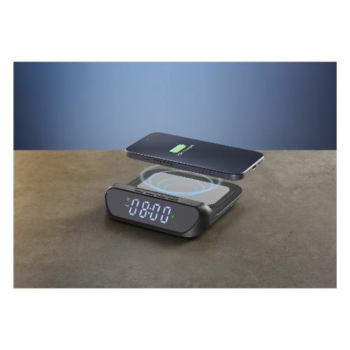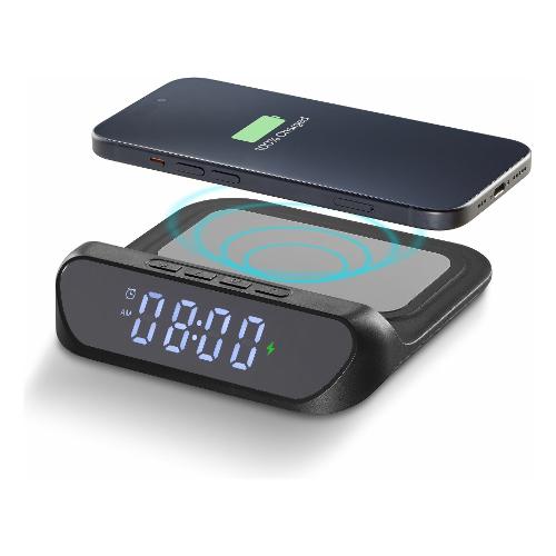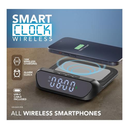 SMART CLOCK WIRELESS è l'innovativa sveglia da comodino che ti permette di ricaricare il tuo smartphone senza cavo. L'innovativa ricarica wireless da 15W permette di caricare velocemente tutti gli smartphone compatibili con questa tecnologia, come: iPhone, Samsung della linea S e altri telefoni compatibili. La sveglia consente di visualizzare l'ora nel formato 24 ore/12 ore, la data e la temperatura ambiente.