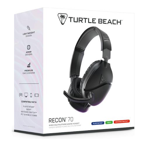 Le cuffie da gioco multipiattaforma Turtle Beach Recon 70 presentano un design all'insegna della leggerezza e del massimo comfort, altoparlanti da 40 mm over-ear e un microfono flip-up ad alta sensibilità.