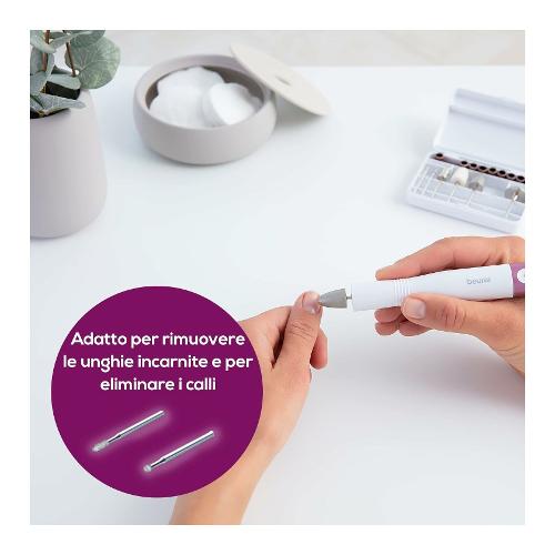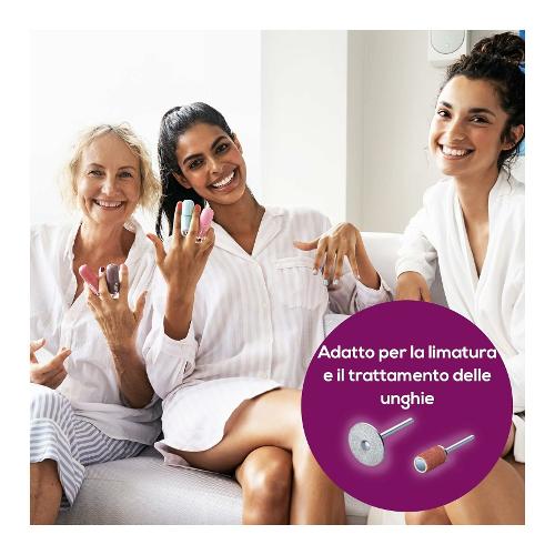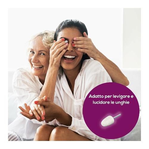 Include 6 accessori in zaffiro e feltro di alta qualità: Disco in zaffiro, a grana fine: per limare e rifinire le unghie, a grana fine. Lima in zaffiro, a grana fine: rimozione di pelle secca, calli o duroni sulla pianta dei piedi o sui talloni e rifinitura delle unghie. Lima in zaffiro, a grana grossa: rimozione rapida di calli spessi o duroni di grandi dimensioni sulla pianta dei piedi e sui talloni. Questo accessorio è adatto per superfici ampie. Lima in feltro: per lisciare e lucidare il bordo delle unghie e pulirne la superficie dopo la limatura. Fresa a fiamma: per liberare le unghie incarnite. Fresa in zaffiro circolare: per rimuovere attentamente i calli. Inclusi 10 accessori monouso in carta abrasivamanicure