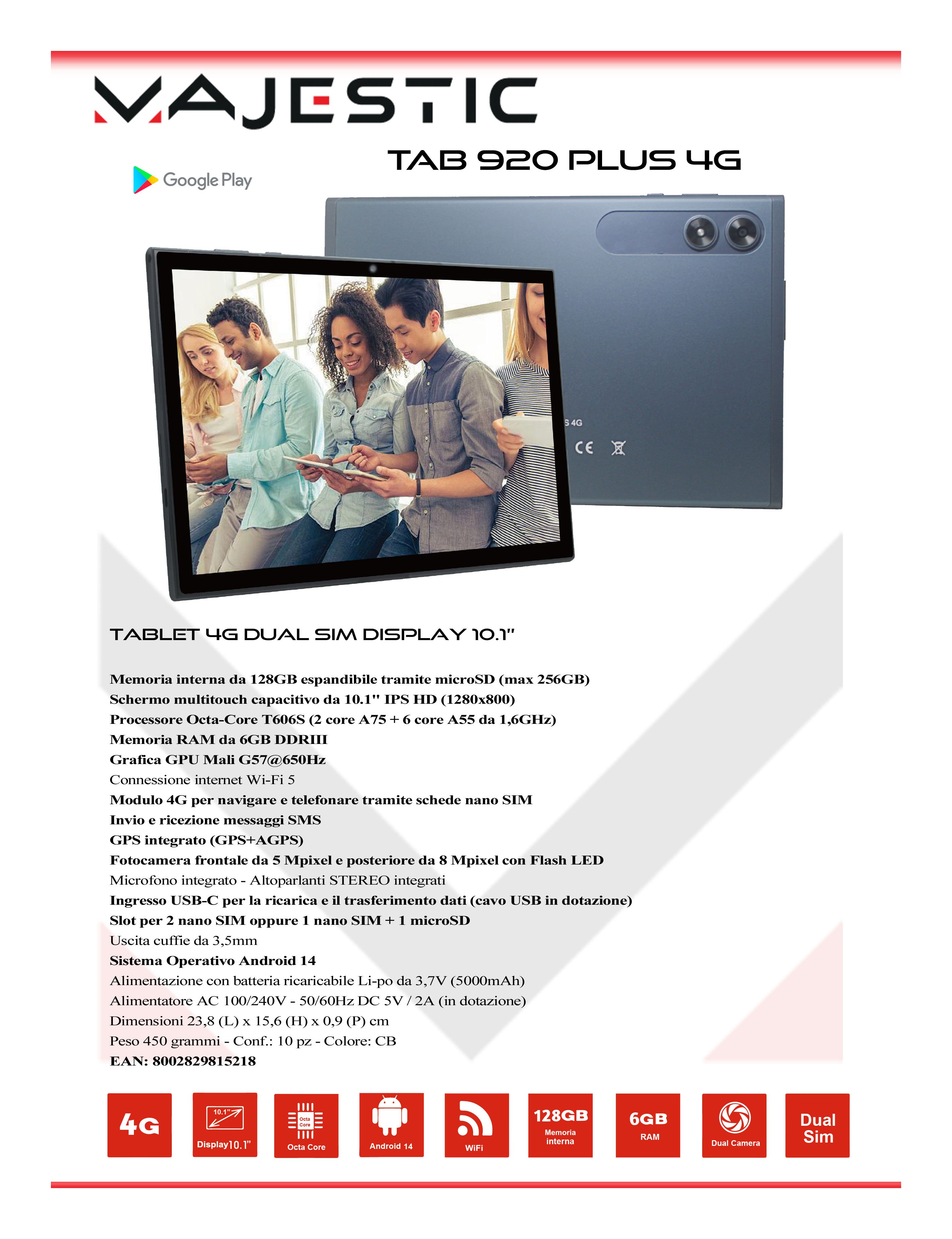Tablet 10,1" TAB 920 PLUS Dual Sim 4G Lte Blu ( 128GB Ram 6GB 5000mAh ) 114920 CB
