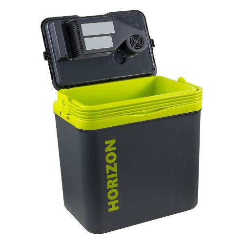 Frigorifero elettrico horizon ideale per i viaggi in auto. Durante il trasporto il coperchio viene bloccato dalla maniglia, così da evitare fuoriuscite di prodotti. Si può trasportare facilmente e, data la compattezza, è necessario solo un ingombro di 37,8 centimetri. Ciò significa che il frigorifero può essere riposto in sicurezza anche nel poggiapiedi dell’auto. Alimentazione per auto 12V DC.