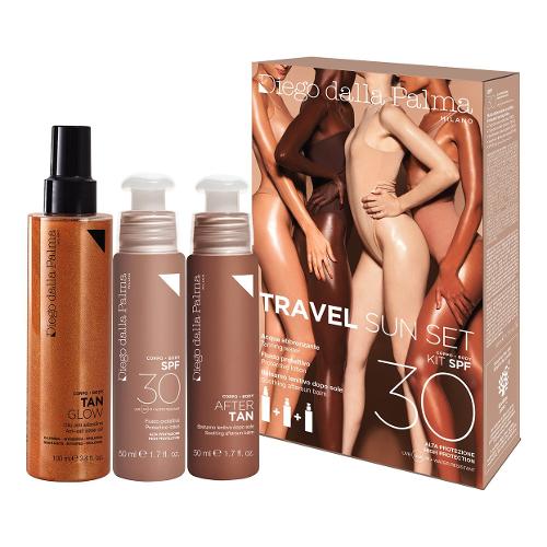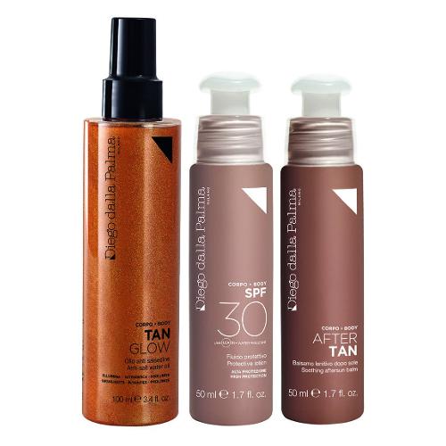 TRAVEL SUN SET KIT SPF 30 ALTA PROTEZIONE In un kit tutto ciò che serve per garantire un'abbronzatura sublime, protezione e rigenerazione per una pelle abbronzata più a lungo e riparata dai danni causati dai raggi ultravioletti e agenti esterni come salsedine e vento. Contiene: - TAN GLOW - acqua illuminante abbronzante corpo: grazie alle sue perle dorate dai riflessi multi-sfaccettati, dona un colorito dorato e glamour e una piacevole sensazione di freschezza e idratazione. - AFTRER TAN - balsamo lenitivo doposole: Crema doposole nutri-lenitiva, intensificatrice di abbronzatura. Dona sollievo ed idratazione alle pelli aggredite dal sole e previene la desquamazione rinforzando la barriera cutanea. - Fluido abbronzante protettivo SPF 30: Fluido solare idratante, dalla texture ultraleggera e dal finish invisibile. Potenzia le difese cellulari e protegge dagli effetti dannosi dei raggi solari, assicura una protezione “attiva” e completa dai raggi solari e protegge la pelle dai radicali liberi e dalla disidratazione. Formato: 100ml + 50ml + 50ml . TAN GLOW: Agitare prima dell’uso. Vaporizzare su tutto il corpo, durante l’esposizione solare, ogni volta che se ne sente il bisogno. Uniformare con le mani. Evitare il contatto diretto con gli occhi. Non contiene protezione solare. AFTER TAN: Applicare con massaggi leggeri su tutto il corpo dopo l’esposizione solare e ogni qualvolta la pelle ne avverte il bisogno. FLUIDO PROTETTIVO ABBRONZANTE: Prima e durante l'esposizione solare, distribuire uniformemente sulla pelle.