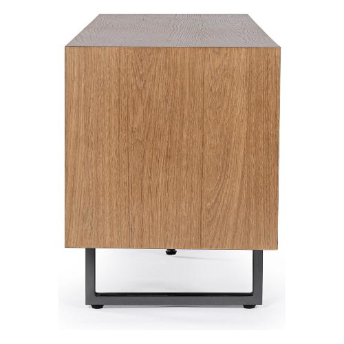 MDF impiallacciato rovere. Finitura naturale con vernice a base d'acqua. Vano ante comprensivo di mensola. Interno ante e cassetti di colore antracite con chiusura ammortizzata in acciaio. Gambe in acciaio verniciate a polvere epossidica