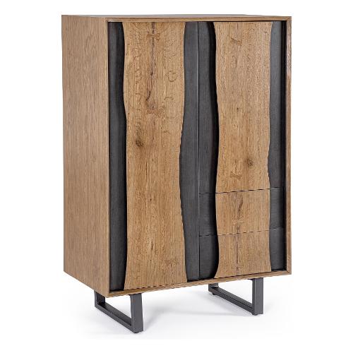 MDF impiallacciato rovere. Finitura naturale con vernice a base d'acqua. Vano ante comprensivo di mensola. Interno ante e cassetti di colore antracite con chiusura ammortizzata in acciaio. Gambe in acciaio verniciate a polvere epossidica