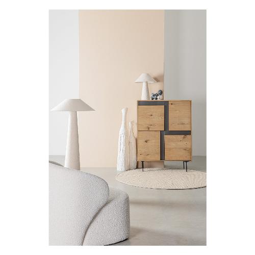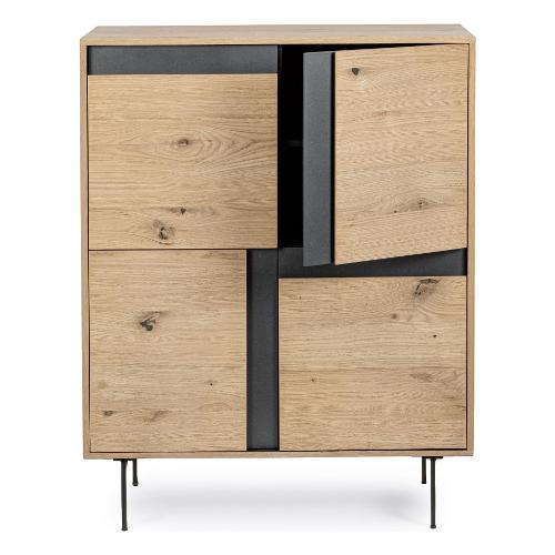 MDF impiallacciato rovere. Finitura naturale con vernice a base d'acqua. Tre vani porta comprensivi di mensola. Gambe in acciaio verniciate a polvere epossidica