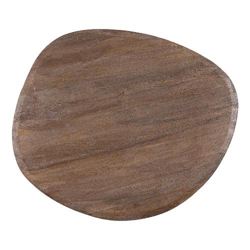 Top in legno di mango con forma irregolare,con verniciatura a base d'acqua e finitura finale a base di nitrocellulosa. Base in acciaio verniciato a polvere epossidica effetto materico