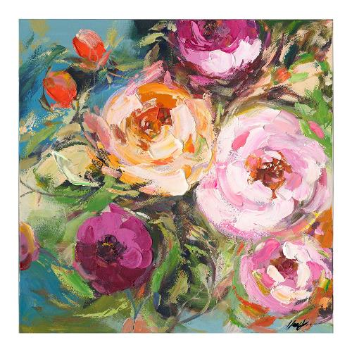 Stampa su tela con dettagli dipinti a mano. Struttura in legno di abete
