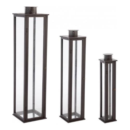 Set3 lanterna torsti marrone scuro legno di abete, vetro e metallo 15,5x15,5x78h; 22x22x103h; 30x30x129h