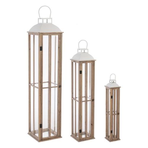 Set3 lanterna shayra nat-bianco legno di abete, vetro e metallo 15,5x15,5x77h; 22x22x104h; 30x30x134h