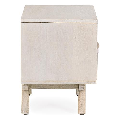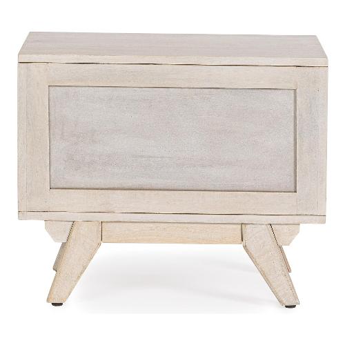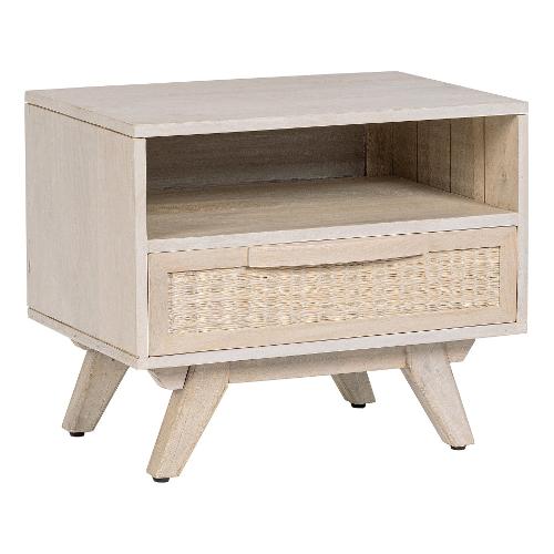 Struttura in legno di mango, schienale e fondo cassetto in MDF. Frontale cassetto in Rattan. Verniciatura a base di nitrocellulosa con decapatura bianca