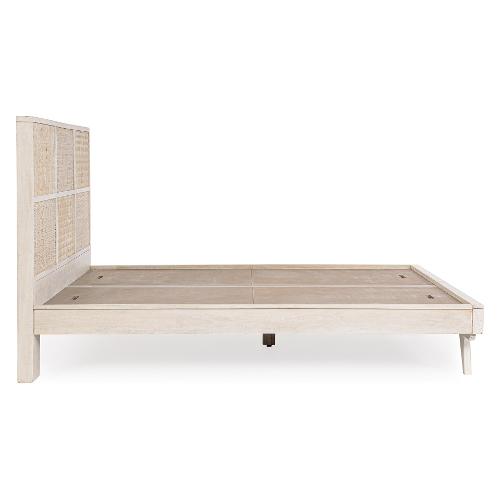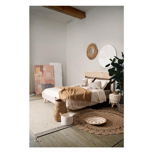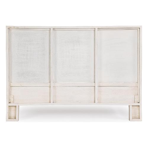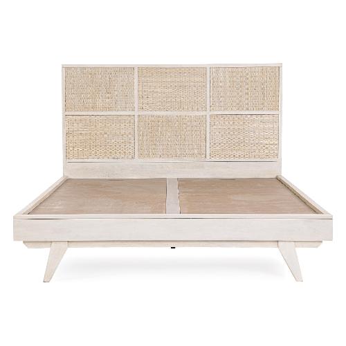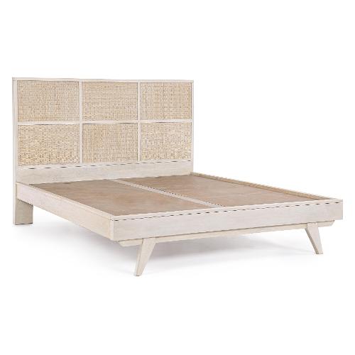 Struttura in legno di mango, schienale in MDF. Frontale testiera in Rattan. Verniciatura a base di nitrocellulosa con decapatura bianca. Fondo letto con pannelli in MDF