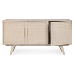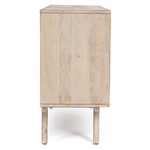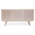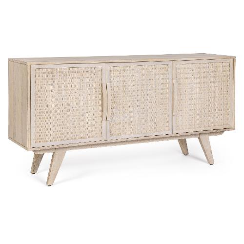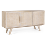Struttura in legno di mango, schienale in MDF. Frontale ante in Rattan. Verniciatura a base di nitrocellulosa con decapatura bianca. Vano porta comprensivo di mensola