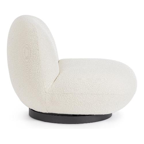 Struttura in legno compensato. Rivestimento in Poliestere effetto bouclé. Densità imbottitura seduta 22kg/m3 schienale 20kg/m3. Non sfoderabile. Base girevole 360° in acciaio verniciato a polvere epossidica