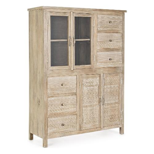 Struttura in legno di mango con decorazioni intarsiate a mano, schienale e fondo cassetti in MDF. Finitura a base di nitrocellulosa. Vano porta comprensivo di mensola. Maniglie e pomelli in ottone