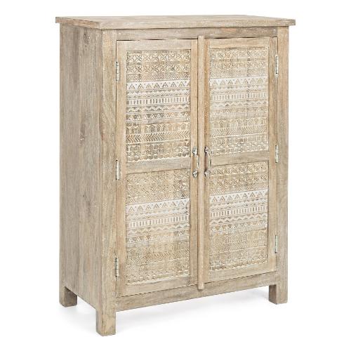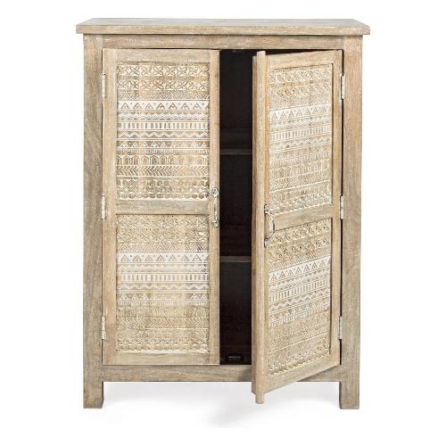 Struttura in legno di mango con decorazioni intarsiate a mano, schienale in MDF. Finitura a base di nitrocellulosa. Vano porta comprensivo di mensole. Maniglie in ottone