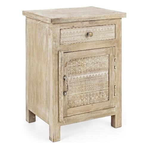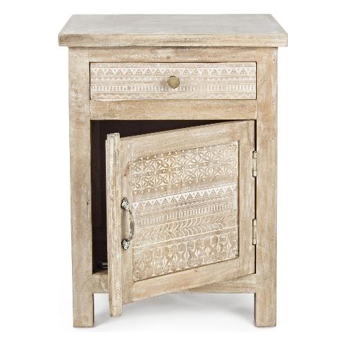 Struttura in legno di mango con decorazioni intarsiate a mano, schienale e fondo cassetti in MDF. Finitura a base di nitrocellulosa. Pomelli e maniglie in ottone