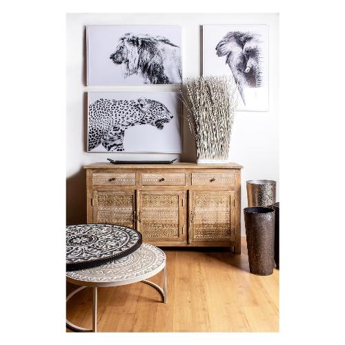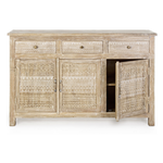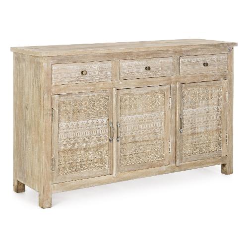 Struttura in legno di mango con decorazioni intarsiate a mano, schienale e fondo cassetti in MDF. Finitura a base di nitrocellulosa. Vano porta comprensivo di mensola. Maniglie e pomelli in ottone