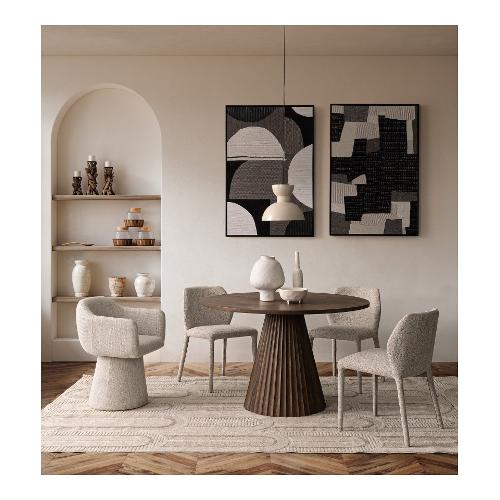 Base gambe in compensato, schienale in acciaio. Seduta girevole 180° con meccanismo di ritorno, in acciaio verniciato a polvere e compensato. Imbottitura in schiuma poliuretanica densità seduta 22 kg/m3 schienale 30kg/m3. Rivestimento in 97% Poliestere 3% Acrilico