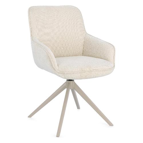 Seduta in compensato con imbottitura in schiuma poliuretanica. Rivestimento in 100% Poliestere. Girevole 360° con meccanismo di ritorno. Gambe in acciaio verniciate a polvere epossidica