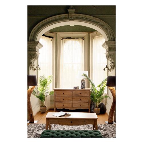 Struttura in legno di mango, fondo cassetti in MDF. Finitura con vernice a base d'acqua. Maniglie in ghisa
