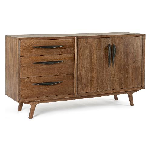 Struttura e gambe in legno di mango con finitura a base d'acqua. Schienale in compensato. Vano porta comprensivo di mensola. Maniglie in acciaio