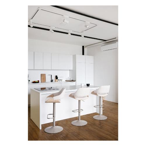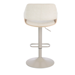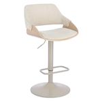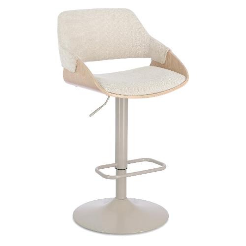 Seduta in compensato impiallacciato legno di pioppo con imbottitura in schiuma poliuretanica. Rivestimento in 100% Poliestere. Seduta girevole 360°. Base in acciaio verniciata a polvere epossidica. Altezza regolabile con sistema a gas