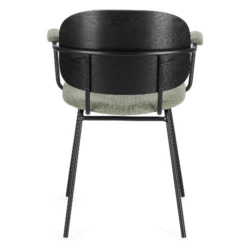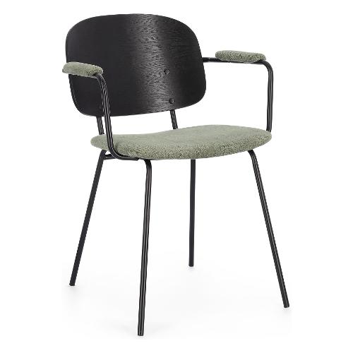 Struttura in acciaio verniciata a polvere epossidica. Schienale in compensato impiallacciato legno di pioppo. Seduta e braccioli in compensato con rivestimento in 100% Poliestere