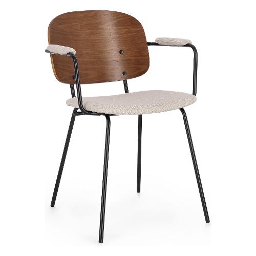 Struttura in acciaio verniciata a polvere epossidica. Schienale in compensato impiallacciato legno di pioppo. Seduta e braccioli in compensato con rivestimento in 100% Poliestere