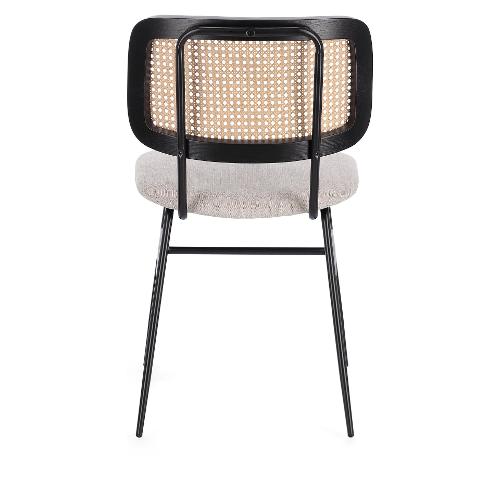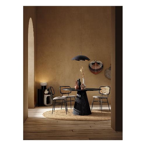 Struttura in acciaio verniciata a polvere epossidica. Seduta in compensato con rivestimento in 100% Poliestere. Schienale in compensato con lavorazione in fibra sintetica effetto Rattan
