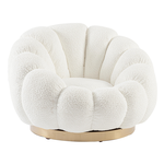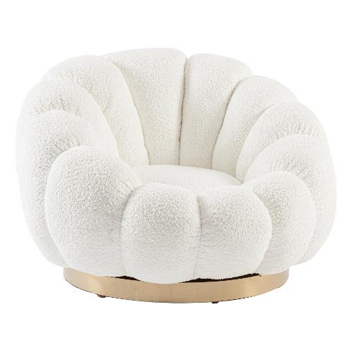 Struttura in compensato. Rivestimento in Poliestere effetto bouclé. Imbottitura in schiuma poliuretanica (densità 25kg/m3 seduta, 18kg/m3 schienale). Fondo con anello decorativo in acciaio verniciato color oro. Seduta girevole a 360°