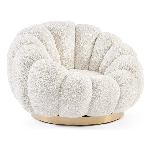 Struttura in compensato. Rivestimento in Poliestere effetto bouclé. Imbottitura in schiuma poliuretanica (densità 25kg/m3 seduta, 18kg/m3 schienale). Fondo con anello decorativo in acciaio verniciato color oro. Seduta girevole a 360°