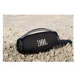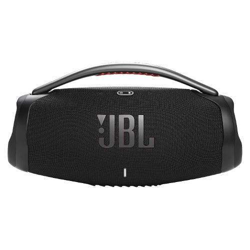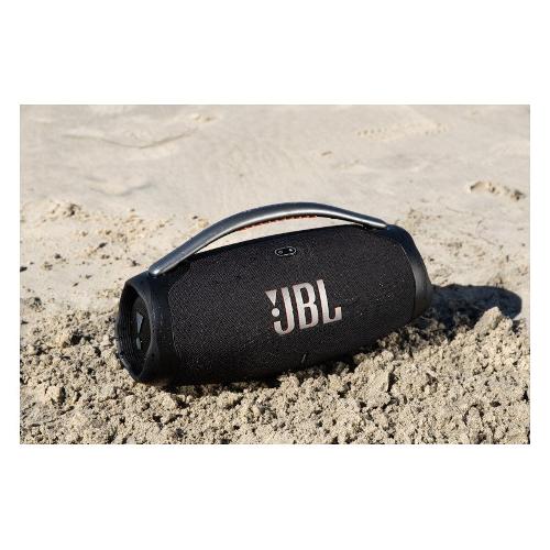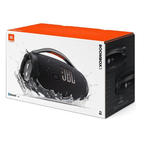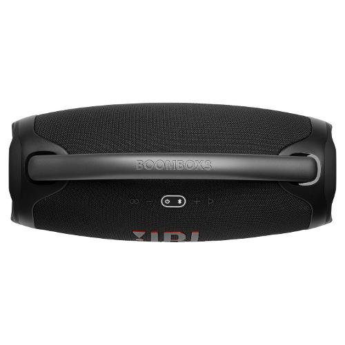 L’iconica silhouette del nuovo JBL Boombox 3 presenta una maniglia in metallo resistente con impugnature in silicone, doppia copertura laterale ed esclusivo tessuto resistente alla polvere e waterproof.