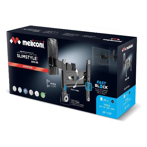 200SR è un supporto rotazione ad un braccio per TV con foratura VESA 75-100-200 mm, adatto alle TV di medio-piccolo formato, dai 26" ai 45", con portata massima 25 kg.