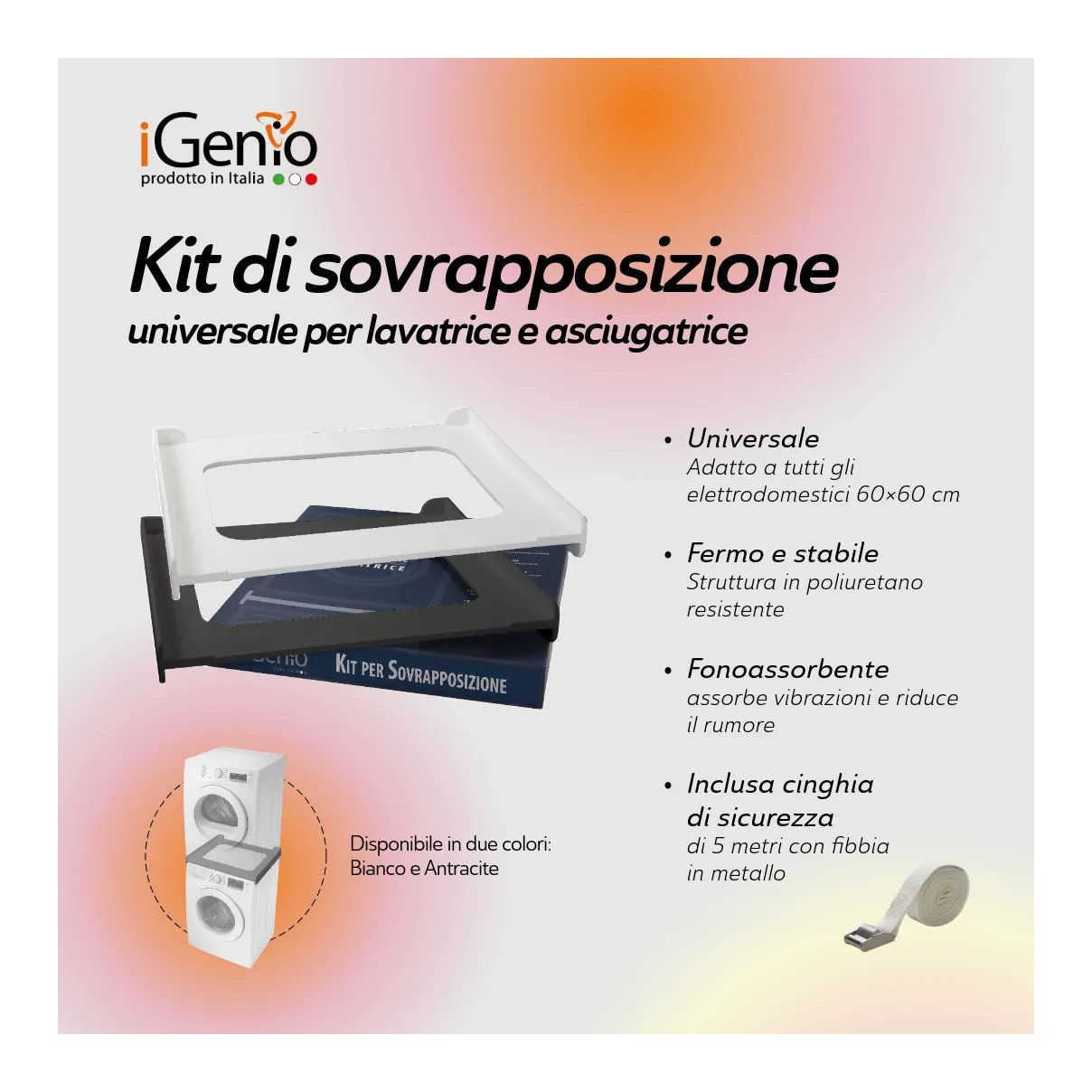 Realizzato per sovrapporre l’asciugatrice alla lavatrice senza dover forare o utilizzare viti in modo da non compromettere la validità della garanzia dello stesso elettrodomestico. Universale e adatto a tutti gli elettrodomestici 60×60 cm. Struttura in poliuretano resistente che rende l’elettrodomestico fermo e stabile assorbendo vibrazioni e riducendo il rumore (fonoassorbente). Evita l’usura e protegge gli elettrodomestici eliminando ogni possibilità d’attrito. Inclusa cinghia di sicurezza di 5 metri con fibbia in metallo.