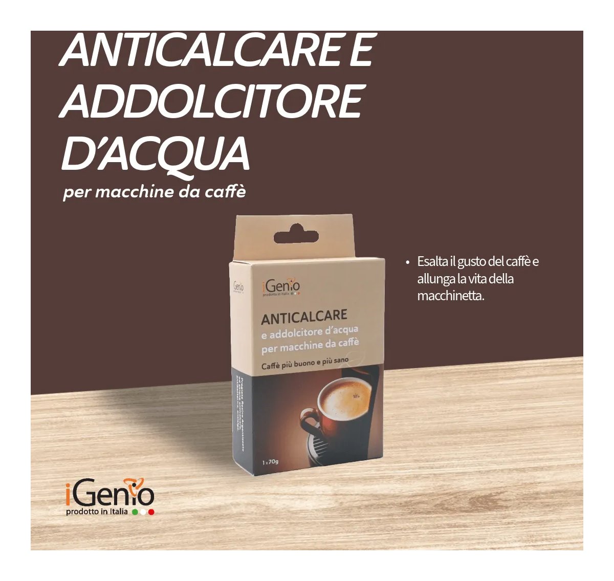 L’anticalcare iGenio è un rivoluzionario sistema studiato per piccoli distributori di bevande calde ad uso domestico per il trattamento di acque potabili. Attraverso il principio osmotico delle soluzioni saline, sottrae all’acqua gli ioni di Calcio e Magnesio che provocano incrostazioni nelle caldaie e negli scambiatori di calore allungandone il ciclo di vita. Contiene delle microsfere di resina bianca e rossa argentizzata che svolgono un’azione anticalcare, antibatterica e antialga. Sacchetto e resine sono certificate per il contatto con gli alimenti. Durata singola bustina: 8 mesi. Esalta il gusto del caffè e allunga la vita della macchinetta.