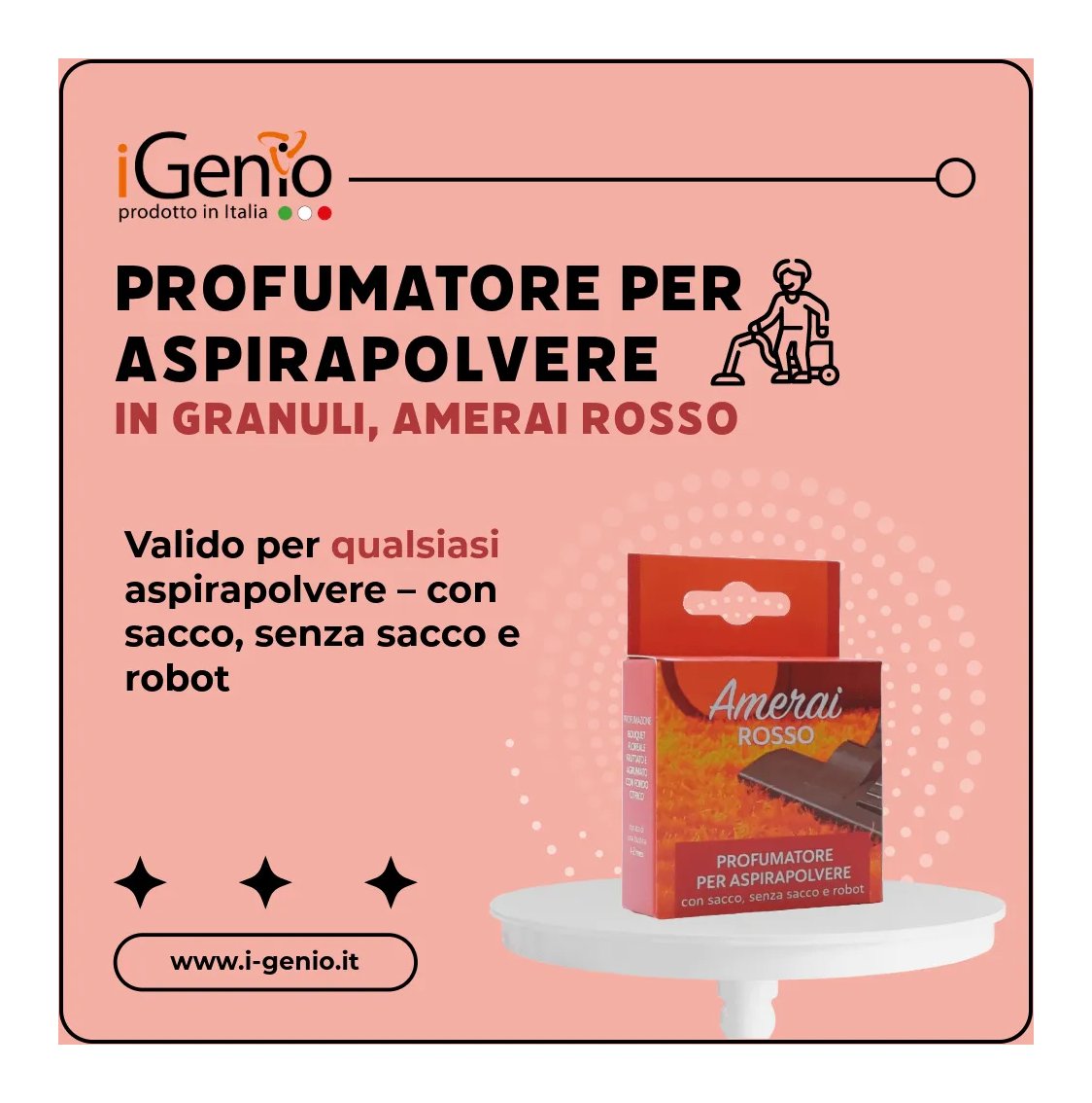 I granuli per aspirapolvere Amerai Rosso sono unici per durata e qualità di fragranza. Ad ogni utilizzo dell’aspirapolvere l’ambiente risulterà piacevolmente profumato. I granuli di profumo combattono gli odori sgradevoli: tabacco, polvere, peli di animali domestici, ecc. Si possono utilizzare su qualsiasi aspirapolvere – con sacco, senza sacco e robot. Il profumo permane fino al completo riempimento del sacchetto in uso. All’interno della confezione si trovano 4 bustine. Profumazione Bouquet floreale, fruttato e agrumato con fondo muschiato.