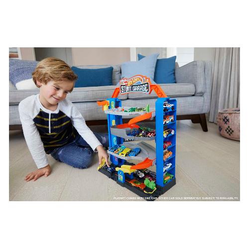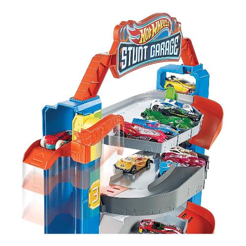Il playset Hot Wheels™ City Garage delle Acrobazie è l'unico garage in cui i bambini possono far saltare le auto da un piano all'altro! Prendi l'ascensore per portare le auto a qualsiasi piano tu voglia e scegli se parcheggiare lì o cominciare a fare acrobazie, saltando al piano inferiore. Con i commutatori, i piccoli possono guidare la loro auto fino a un particolare piano oppure possono recarsi al piano terra per una revisione totale della vettura. Fai il pieno di carburante e assicurati che l'auto sia pronta per la prossima avventura! Ogni playset Hot Wheels™ City si collega direttamente agli altri e alle piste City grigie ed è comunque compatibile con le classiche piste arancioni.