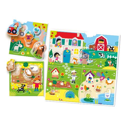 Un gioco per scoprire ogni angolo della fattoria. Posizionando le tessere sagomate nei giusti spazi il bambino imparerà a conoscere oggetti e animali che vivono al suo interno. Potrà giocare liberamente oppure compiere le prime classificazioni, dividendo le tessere secondo l'ambiente di appartenenza: stalla, aia, orto, recinto o pollaio. Include 6 cartelle-ambiente e 30 tessere sagomate