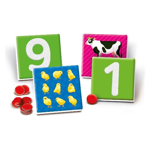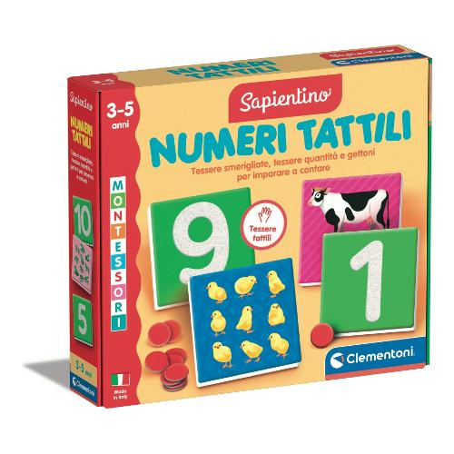 Contiene 10 tessere dalle cifre con speciale finitura ruvida da toccare per memorizzarne la forma. Il bambino attraverso il tatto impara inizialmente a riconoscere la forma dei numeri e poi sviluppa la capacità di associazione abbinandoli alle tessere quantità e ai gettoni.