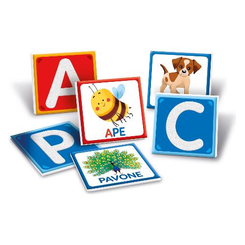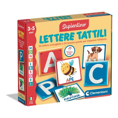 Contiene 10 tessere con lettere a speciale finitura ruvida da toccare per memorizzarne la forma. Il gioco contiene inoltre 26 soggetti sagomati il cui nome a seconda dell'iniziale, va abbinato alla giusta lettera dell'alfabeto. Le lettere in corsivo sono strumento fondamentale utilizzato nelle scuole montessori per l'apprendimento delle lettere in età prescolare