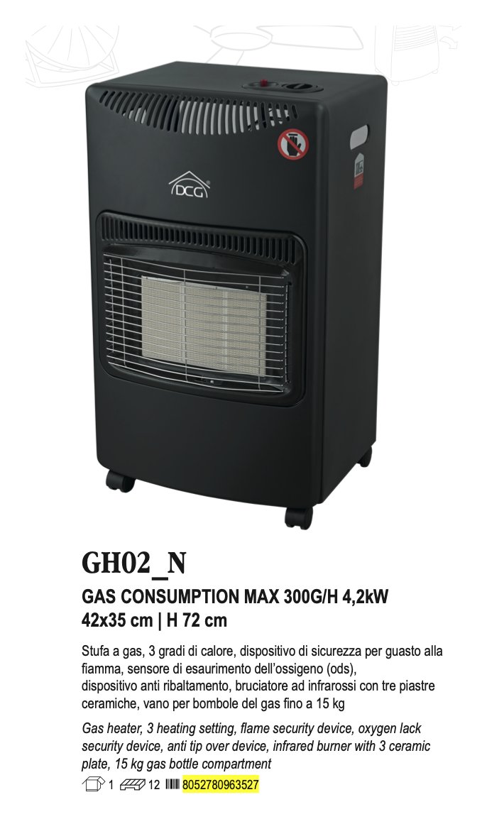 Dotato di sensore di riduzione di ossigeno ODS con dispositivo di protezione anti spegnimento. Vano per bombola del gas fino a 15 kg (Tubo del gas e regolatore di pressione NON inclusi). Adatto per stanze fino a 80 mq.